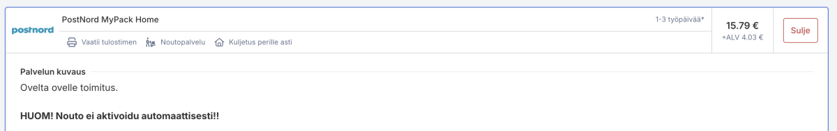 For Posti freight, pickup is included in the price, and when either sender or recipient is a private individual, Posti will contact the customer before pickup and delivery. When orders are made before 11:45 AM, pickups are generally made the same day, subject to regional exceptions.