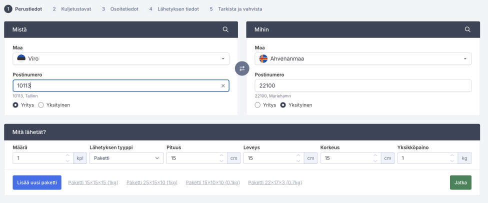 Kun teet pakettilähetyksen Ahvenanmaalle, huomioithan että vastaanottajan maaksi tulee sinun valita Ahvenanmaa Suomen sijasta, alla esimerkki miten saat haettua hinnat lähetykselle Ahvenanmaalle, Ahvenanmaan postinumero on sama viisinumeroinen formaatti kuin Suomessa: